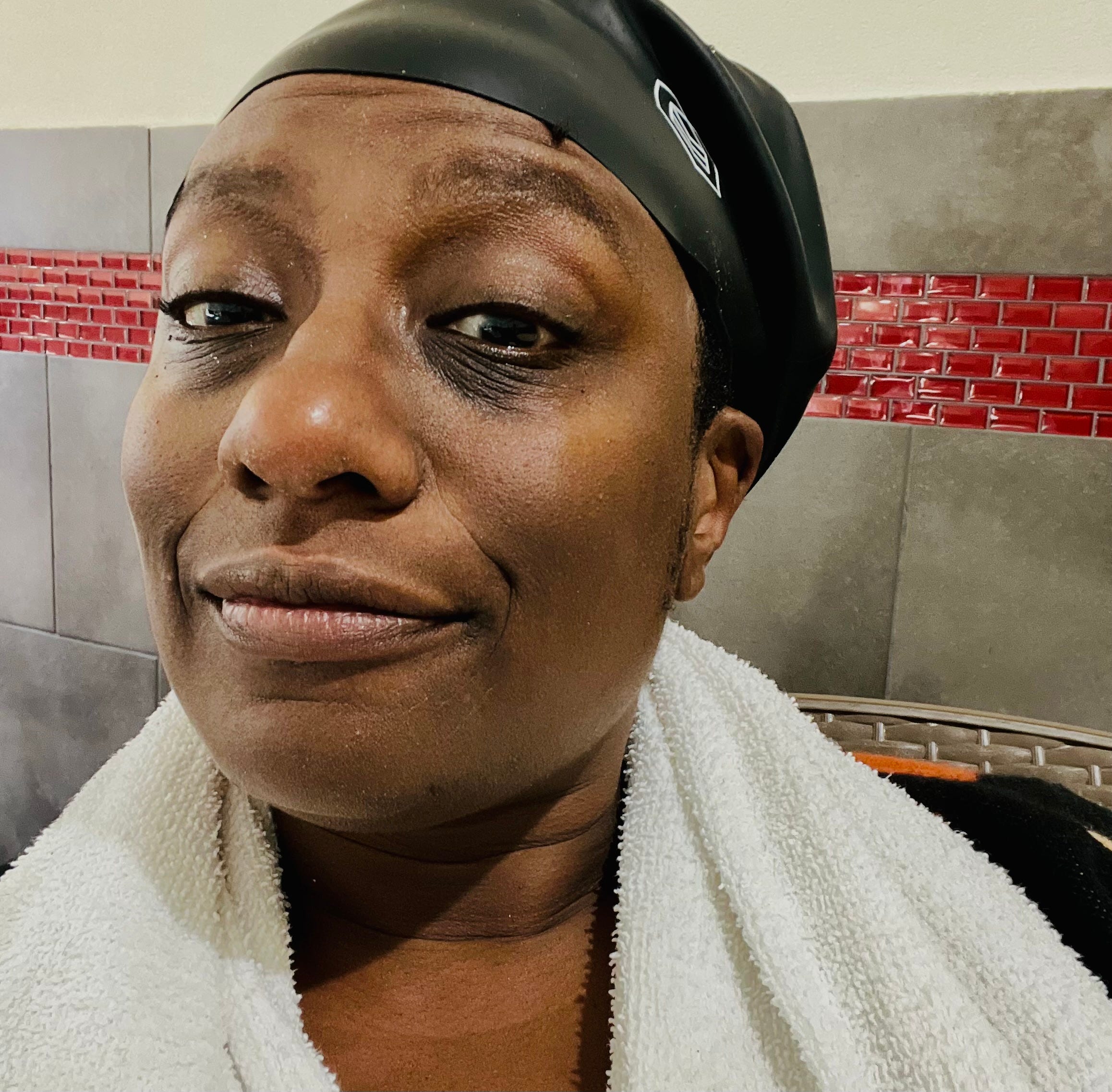 [Image description: Atena at the pool of Comfort Suites Hotel, with a towel draped over her shoulders, and a swimming cap on her head.]