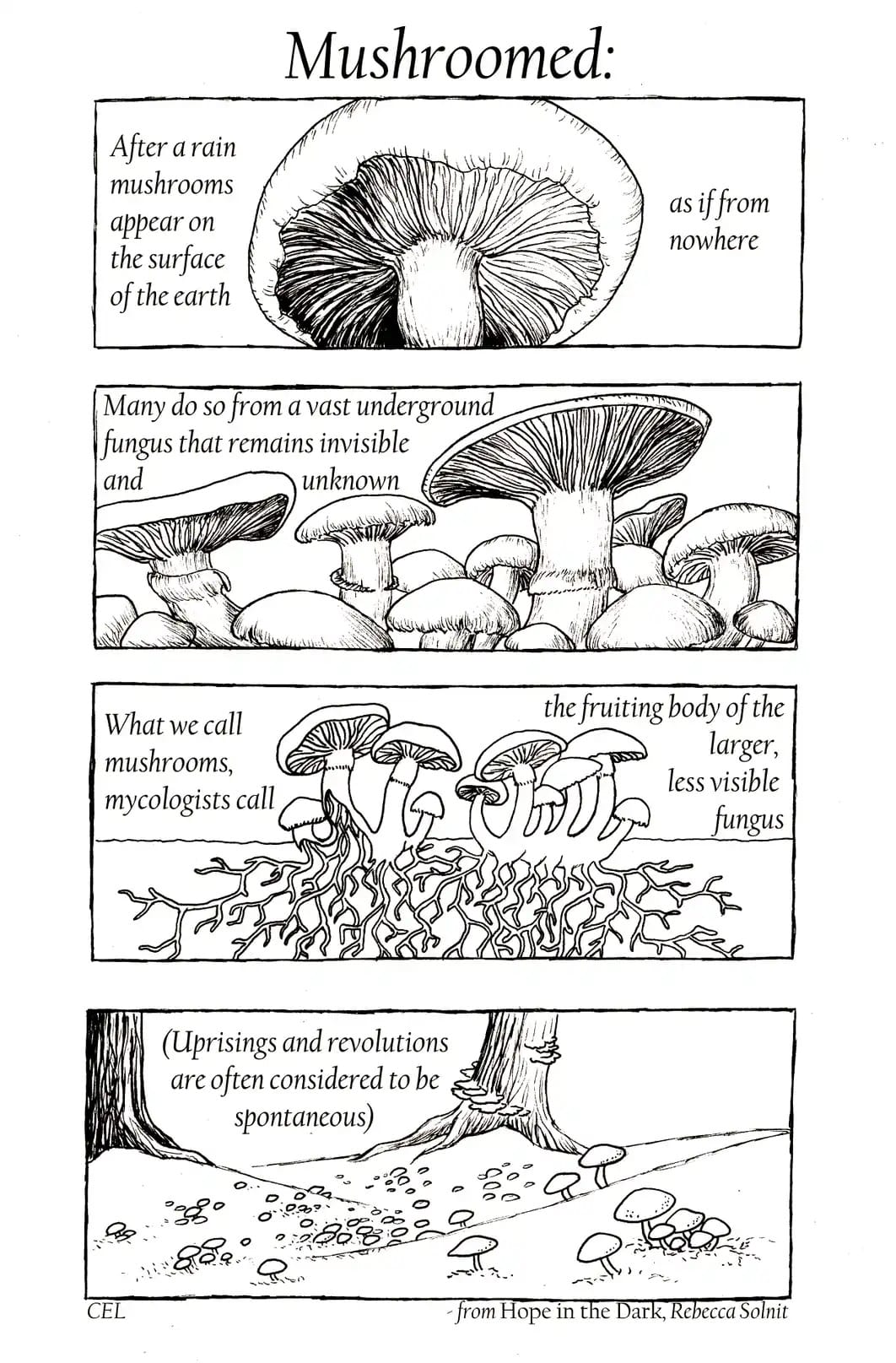 [Image description: a comic about mushrooms titled “MUSHROOMED.” It depicts four panels with text and illustrations. The first panel shows a drawing of the underside of a single, round mushroom cap, with the caption “After a rain, mushrooms appear on the surface of the Earth…As if from nowhere.” The second panel states, “Many do so from a vast underground fungus that remains invisible and unknown.” This is illustrated with many round mushroom caps and stems, tops and undersides, crowded together. The third panel says, “ what we call mushrooms, mycologists call… the fruiting body of a larger, less visible fungus.” This is depicted with two clusters of mushroom caps and stems growing from a shared underground network of mycelium. The final panel states, “Uprisings and revolutions are often considered to be spontaneous.” This is illustrated with a wide view of two slopes with dozens of mushrooms scattered among them between the bases of two tree trunks; the tree on the right has mushrooms growing up the side of the trunk. Text beneath the final panel reads, “CEL” on one side, and “from Hope in the Dark, Rebecca Solnit” on the other.]