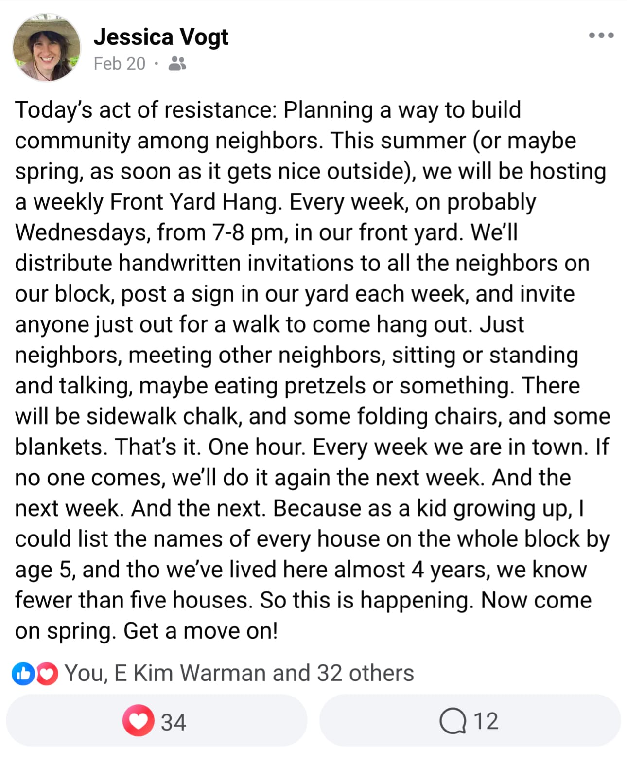 [Image description: Facebook post by Jessica V., February 20. 34 heart reactions, 12 comments. Profile picture shows a close up of a smiling white woman with brown hair wearing a wide-brim hat. Text reads: Today’s act of resistance: planning a way to build community among my neighbors. This summer (or maybe spring, as soon as it gets nice outside), we will be hosting a weekly front yard hang, every week, on probably Wednesdays, from 7 to 8 PM, in our front yard. We’ll distribute handwritten invitations to all the neighbors on our block, post to sign in our yard each week, and invite anyone just out for a walk to come hang out. Just neighbors, meeting other neighbors, sitting or standing and talking, maybe eating pretzels or something. There will be sidewalk chalk, and some folding chairs, and some blankets. That’s it. One hour. Every week we are in town. If no one comes, will do it again the next week. And the next week. And the next. Because as a kid growing up, I could list the names of every house on the whole block by age 5, and though we’ve lived here almost 4 years, we know fewer than five houses. So this is happening. Now come on spring. Get a move on!]