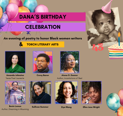 - I was invited to be a reader at an excellent event online; my dear friend Dana Weekes brilliantly braided together a list of very cool and talented poet friends and her connection with TORCH Literary Arts (an organization established to publish and promote creative writing by Black women), by hosting an enriching, delightful, much-needed event. We got together and shared our love of poetry alongside our love of Dana! Such an honor to have been included alongside such talented artists!