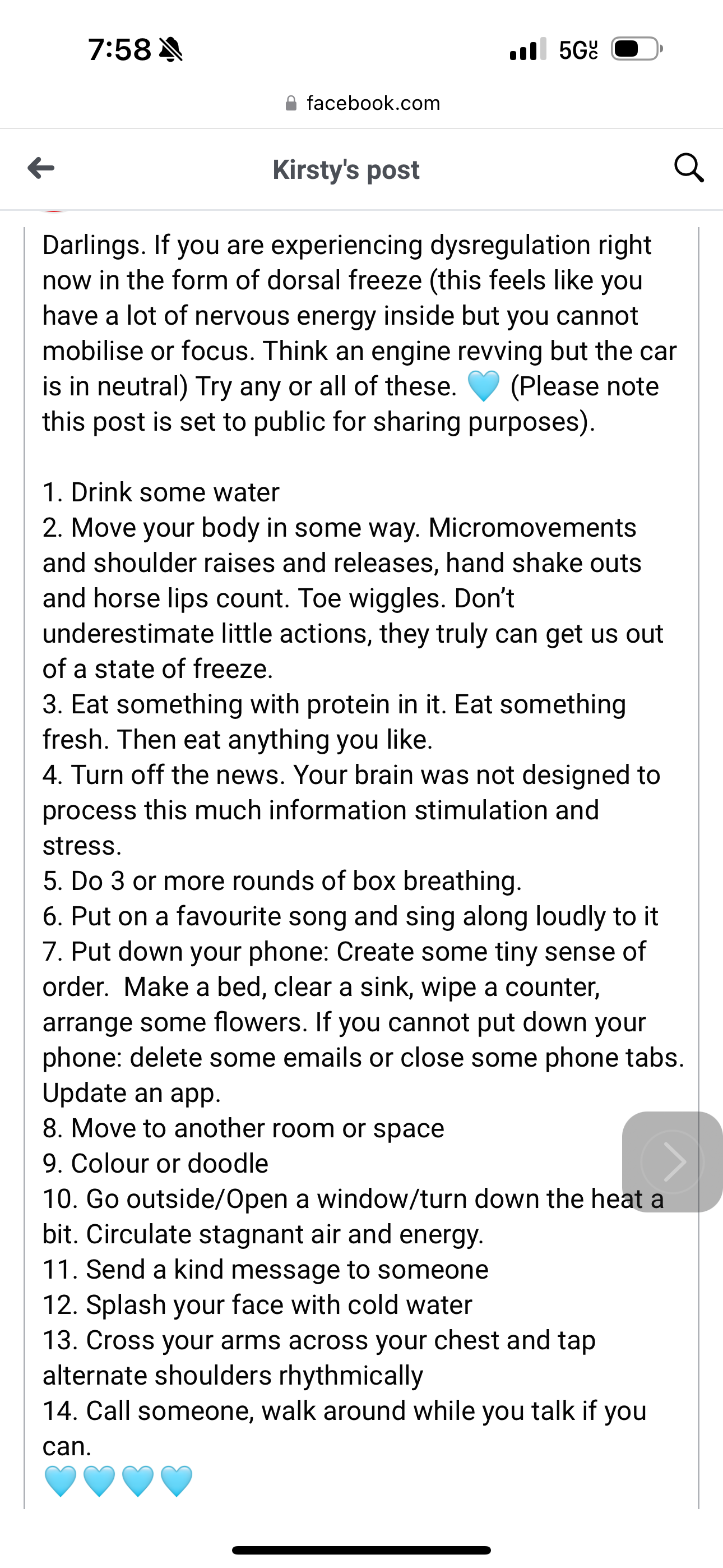 - Move your body in some way. Micromovements and shoulder raises and releases, hand shake outs and horse lips count. Toe wiggles. Don’t underestimate little actions, the truly can get us out of a state of freeze.